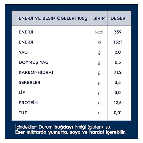 Durum buğdayı irmiği, su Durum buğdayı irmiği. Eser miktarda soya ve yumurta içerebilir.